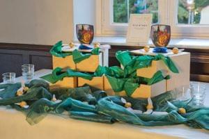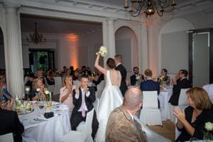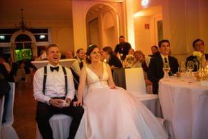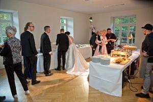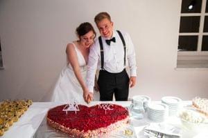 Nach den ersten Häppchen zogen wir ins Schloss, wo der Brautvater eine kurze Rede hielt und das Brautpaar sich bei allen bedankte. Daraufhin wurde das Buffet eröffnet und lecker gegessen und getrunken. Zum Nachtisch wurde die Beerenherztorte des Paares angeschnitten und verköstigt.