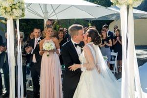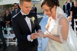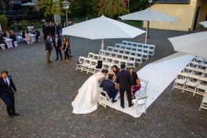 Die Trauung wurde von unserer Freundin aus Seattle, Arabelle gehalten. Mit persönlicher Note erzählte sie von unserer Kennenlerngeschichte und unserer gemeinsamen Zeit in Deutschland und den USA. Sie vermählte uns vor den Augen unserer Familien und Freunden und half uns mit Schnaps und Ringetausch den Sprung in die Ehe zu meistern.